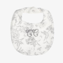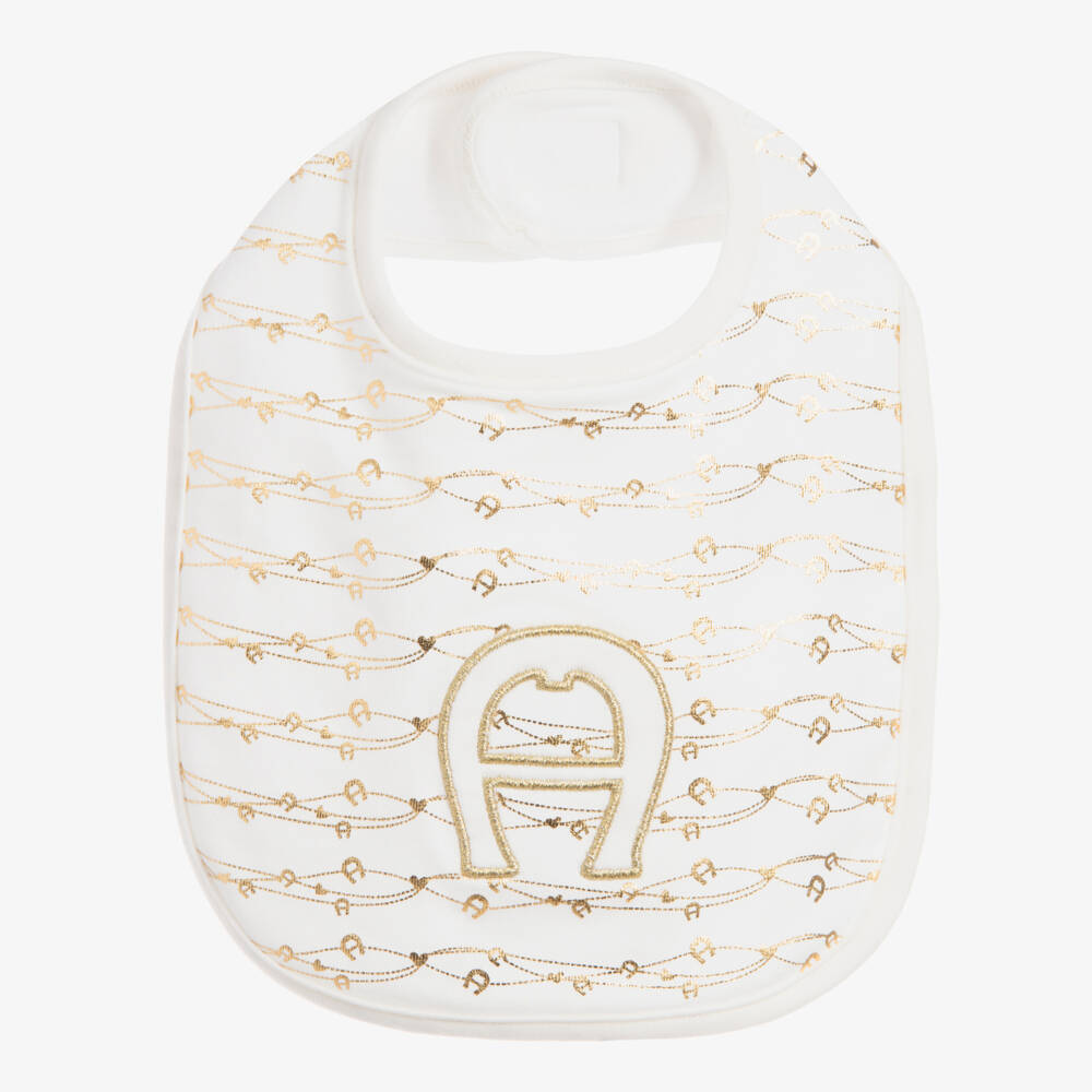 Ivory bib for baby boys and girls by AIGNER, made in soft, stretchy Pima cotton jersey. It has shiny golden logo print, with an embroidered logo on the front and velcro to fasten on the back.