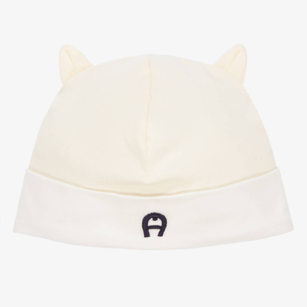 Ivory layette hat for baby boys and girls by AIGNER, with cute little ears on the top. Made in super soft Pima cotton jersey, it is comfortable for baby's delicate skin. The contrast pale ivory brim has the brand's signature 'A' horseshoe logo embroidered in navy blue on the front and a logo tab on the back.