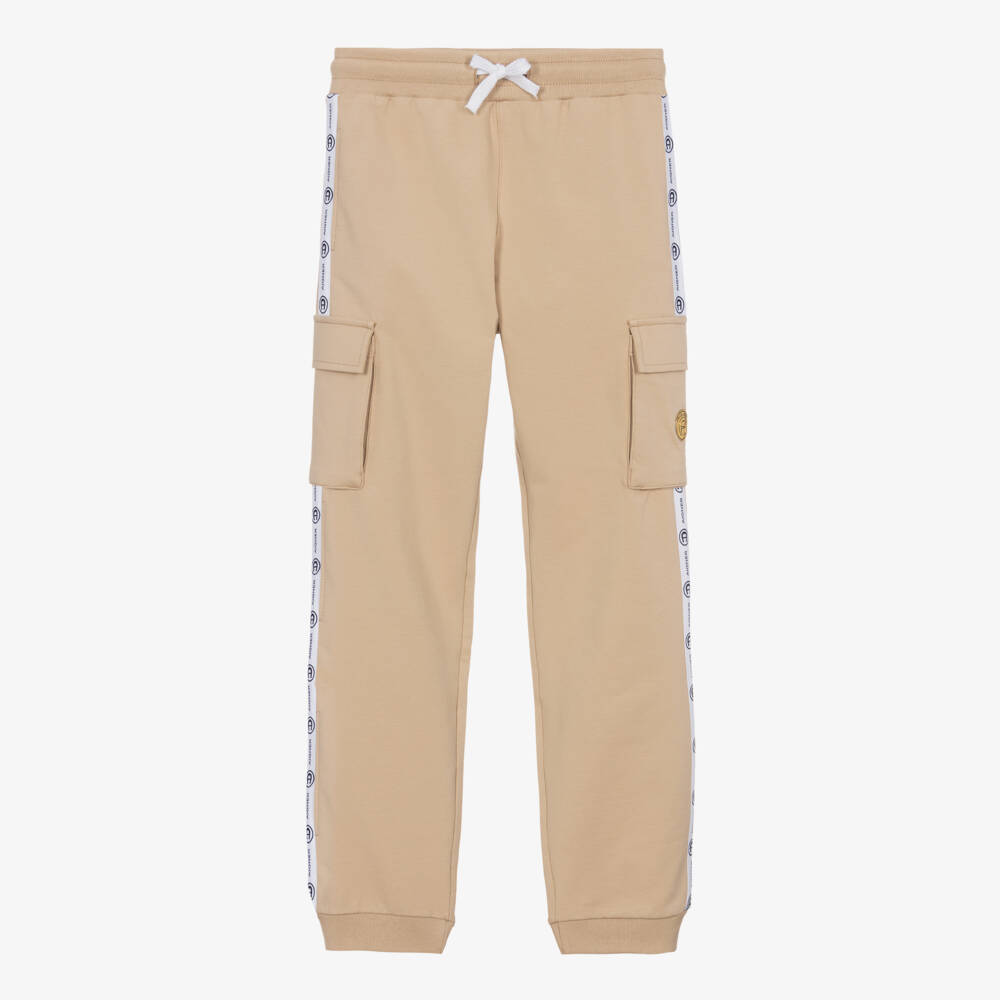 Beige joggers for teen boys from AIGNER, with cargo-style pockets and white branded side trim for a casual sporty look. Made in soft cotton jersey with concealed front pockets, this cuffed style has an elasticated waist with an adjustable drawstring tie. For a designer finish, there is a shiny gold signature 'A' logo patch on one pocket.