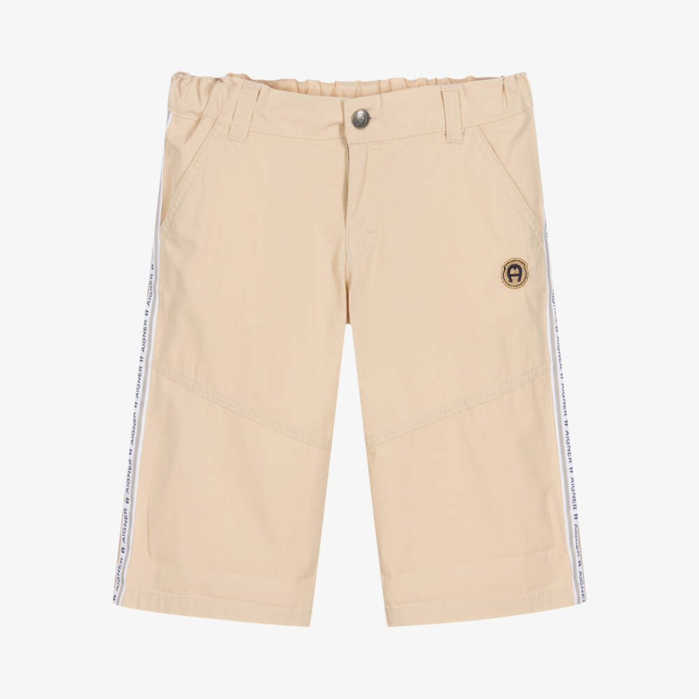 From AIGNER, beige Bermuda length shorts for teen boys with the brand's signature 'A' horseshoe logo for a designer touch. The sides have white logo tape trims and they fasten with a branded button above a zip on the front. Cool and casual, they are made in lightweight cotton and have four useful pockets.