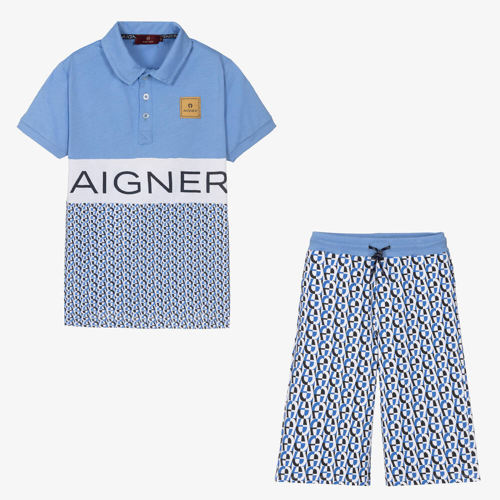 Light blue, white and black shorts set for teen boys from AIGNER. The short-sleeved, button-down polo shirt has a gold label, tab and prints, all with the stand-out 'A' horseshoe logo for that cool designer look. Decorated with matching graphics, the shorts have handy side pockets, logo embroidery on the back, and an elasticated waist with drawstrings. Great for those comfortable, casual days, both are made from soft, stretchy cotton.