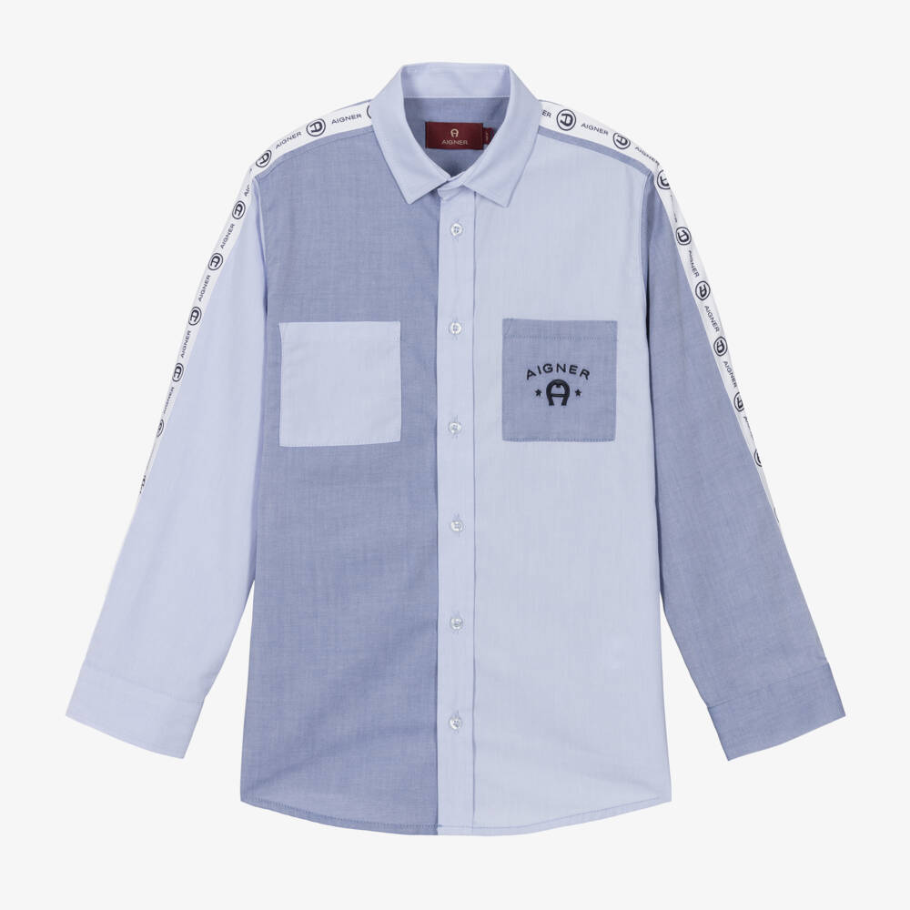 Stylish Oxford cotton shirt for teen boys from AIGNER, in contrasting shades of blue. For instant designer appeal, it has an embroidered logo on the chest pocket and white logo tape along the sleeves, featuring the signature 'A' horseshoe motif. The shirt fastens with branded buttons on the front and cuffs to complete the look.