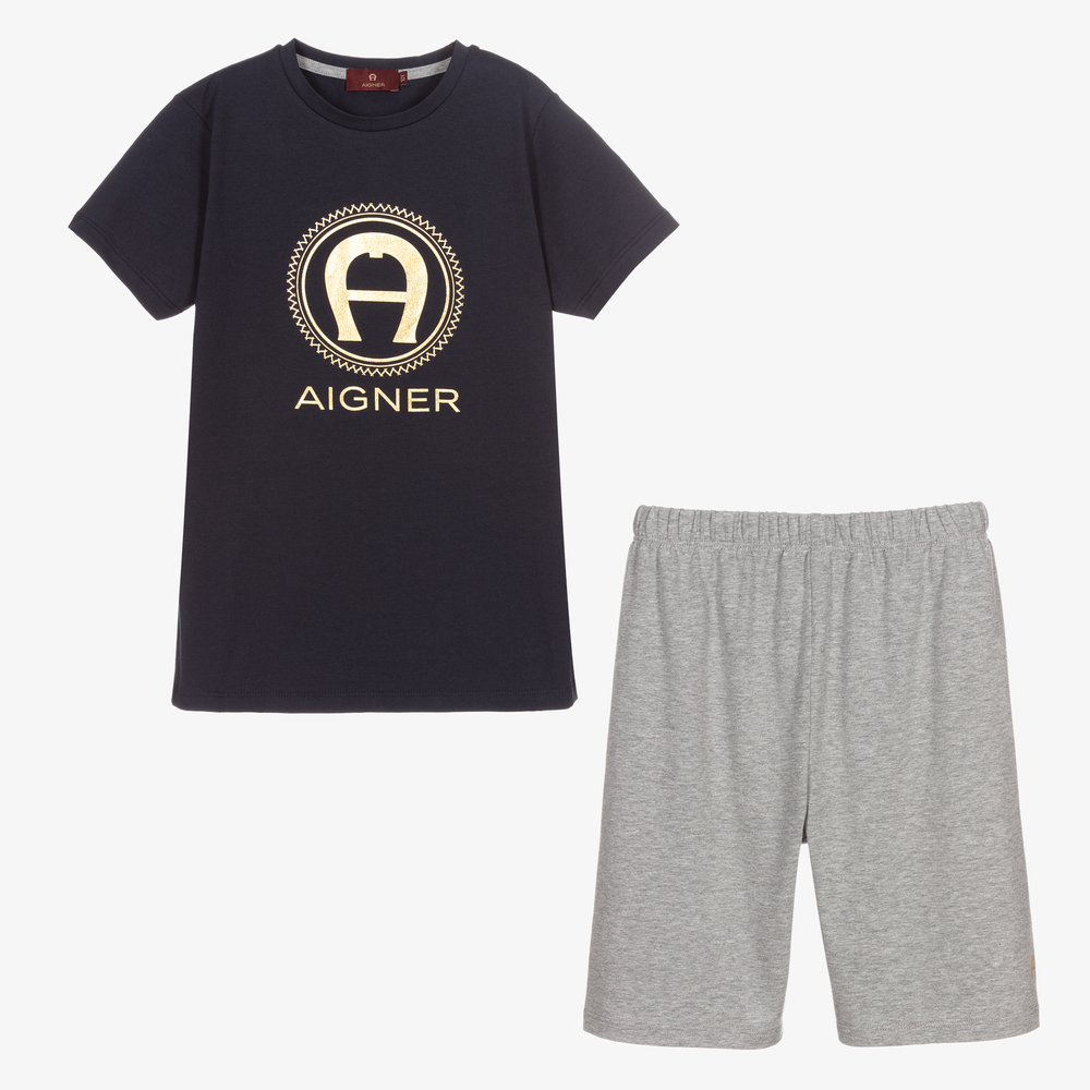Navy blue and grey short pyjamas for teen boys by AIGNER, made in soft and stretchy cotton jersey. The navy blue top has the brand's signature 'A' horseshoe logo print on the front in gold foil. The grey shorts have an elasticated waist and a matching gold logo print on one leg.