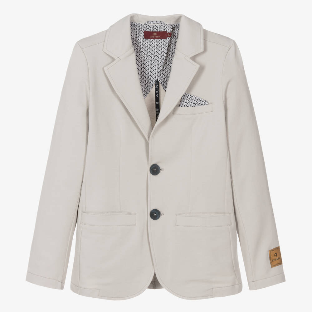 Both smart and comfortable, this pale grey blazer for teen boys is by German brand AIGNER. In a fitted style, it is made in stretchy cotton jersey with a vent detail around the back. It has a white, grey and black logo-patterned lining, featuring the designer's signature 'A' horseshoe, and a gold-tone logo patch stitched on the sleeve for a distinctive finish. The front has blue toned button fastenings, two pockets, and a detachable logo-patterned pocket square for a stylish finish.