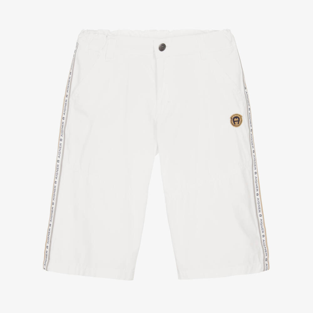 From AIGNER, white Bermuda length shorts for teen boys with the brand's signature 'A' horseshoe logo for a designer touch. The sides have white logo tape trims and they fasten with a branded button above a zip on the front. Cool and casual, they are made in lightweight cotton and have four useful pockets.
