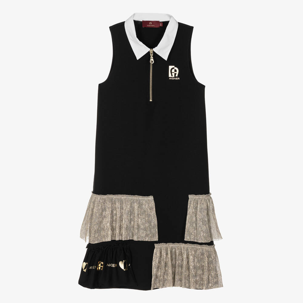 Teen girls striking black dress from AIGNER, featuring the signature 'A' horseshoe logo in metallic gold. Designed in a stylish sleeveless shape, this dress has a white poplin collar with a gold-tone zip and shimmery ruffled trims. It is made from soft cotton jersey, ensuring this party look is effortless to wear.