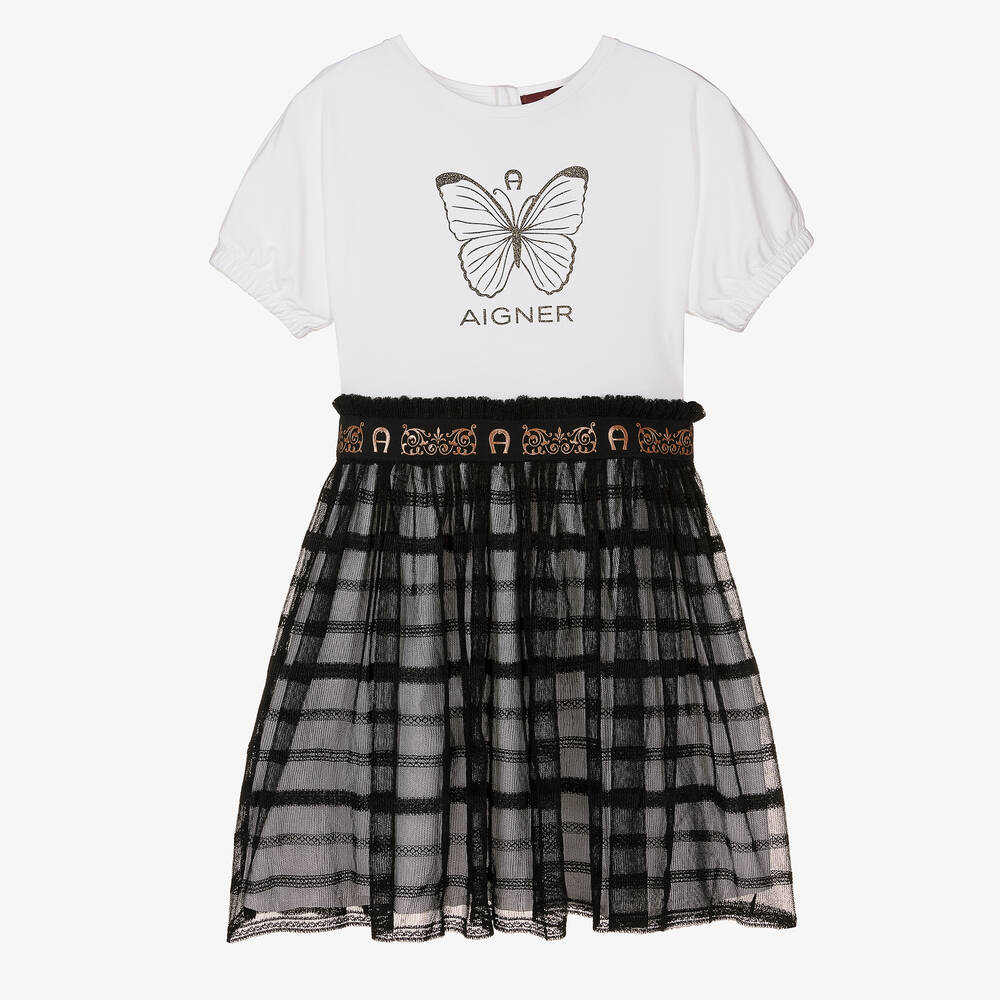 White and black T-shirt dress for teen girls by AIGNER, featuring a sparkly butterfly graphic and the brand's signature 'A' horseshoe logo on the front. Designed for a two-in-one silhouette, the cotton jersey bodice has elasticated cuffs, a casual round neckline and button fastenings on the back. The cotton skirt has a black stretchy mesh overlay, complete with a rose gold logo band that cinches at the waist.