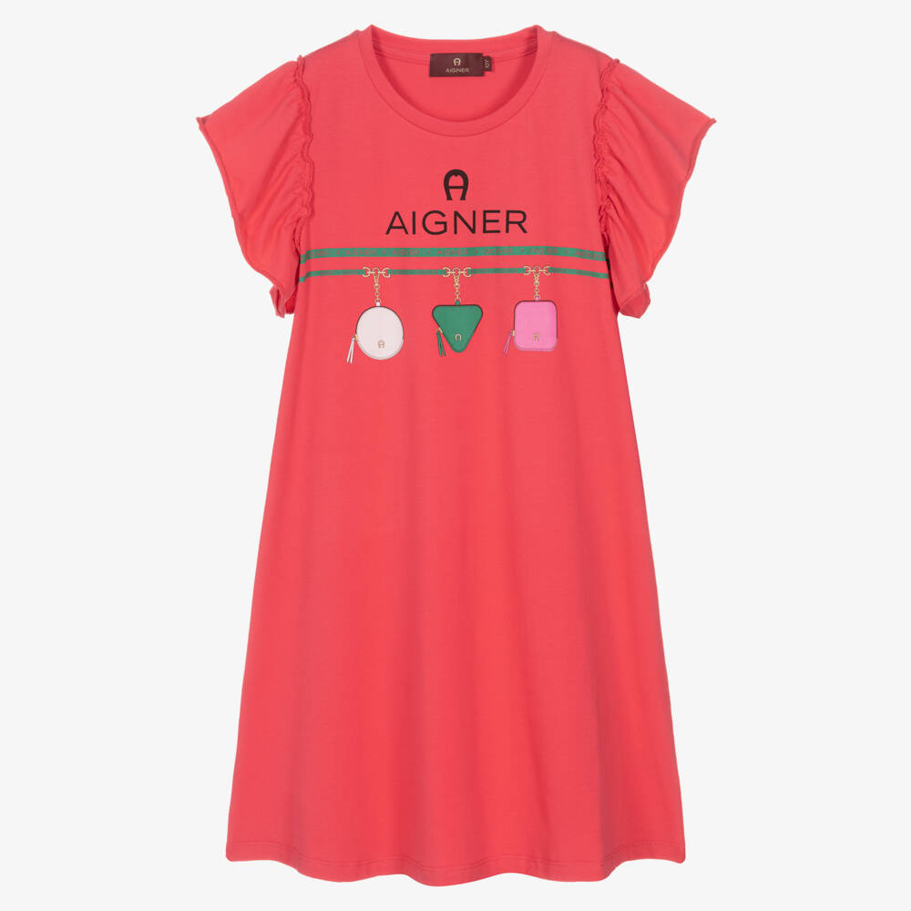 Dark-pink cotton dress for teen girls by AIGNER, made in soft and stretchy jersey. Cut in an A-line shape, it has flutter sleeves with frilled seams for a feminine look. Featuring the brand's signature 'A' horseshoe, the dress has logo tape, geometric bag prints and gold chain graphics across the front in green, black and pink for an undeniably designer look