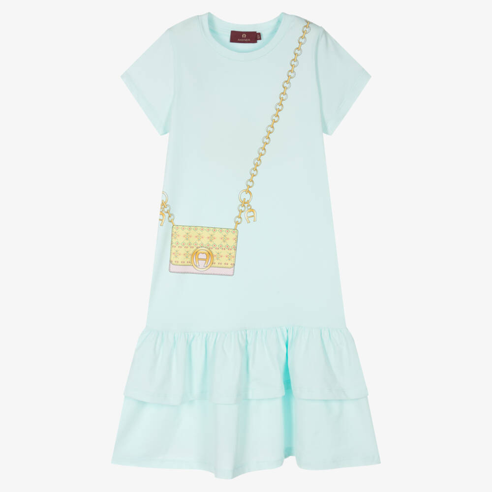 Instantly recognisable as AIGNER, green dress for teen girls with a crossbody bag print incorporating the brand's signature 'A' horseshoe logo. With a drop-waist and gathered frill skirt, it has a feminine silhouette whilst the soft cotton jersey is comfortable.
