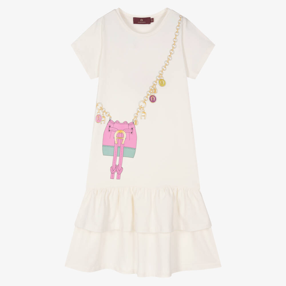 Ivory cotton dress for teen girls by AIGNER, made in stretchy, comfortable jersey. It has a cool Trompe l'oeil bucket bag graphic in pink and grey, with the designer's signature 'A' horseshoe logo detailed on the gold chain print. It has a tiered ruffle skirt and stylish dropped waist to complete the look.