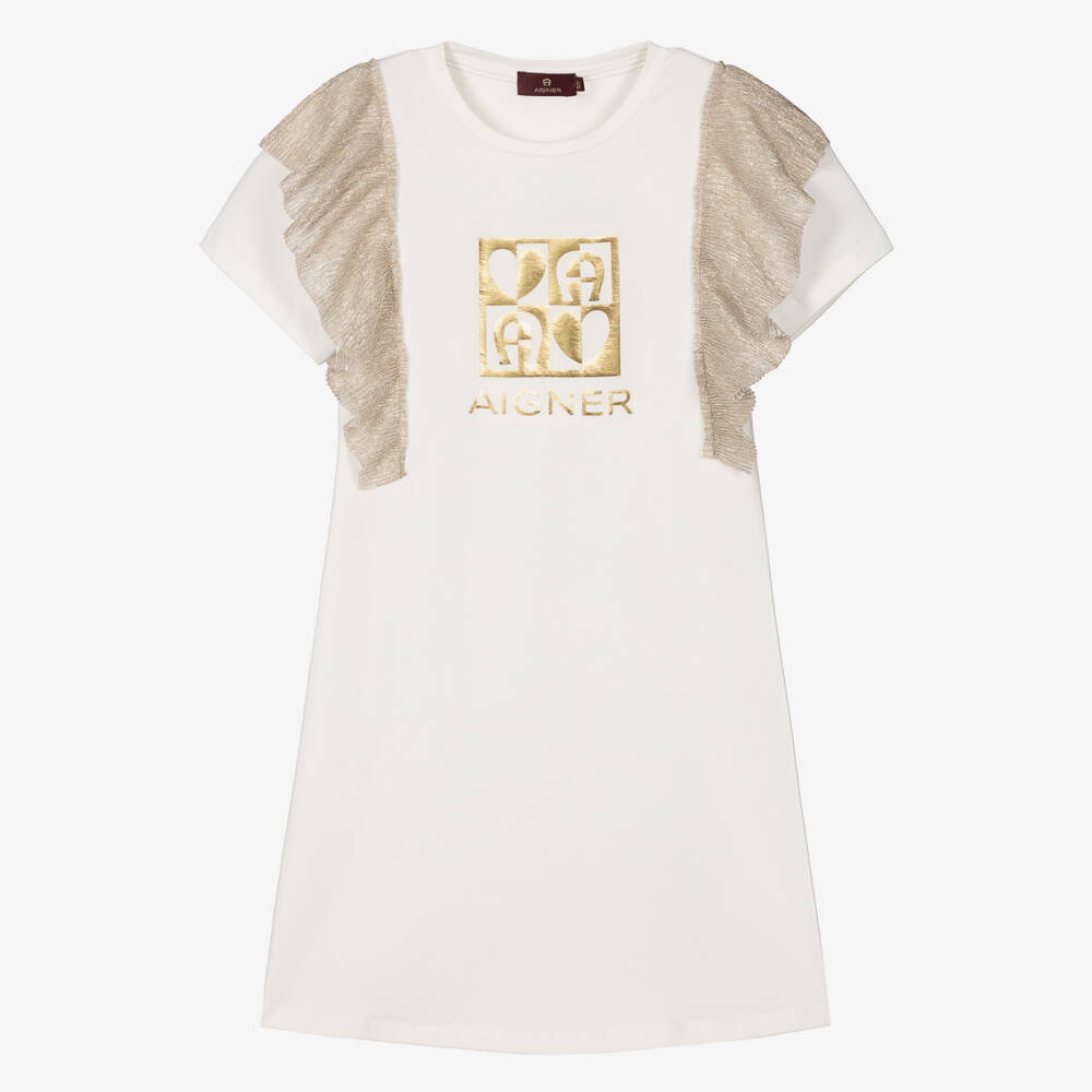 An eye-catching ivory jersey dress for teen girls from AIGNER, featuring the signature 'A' horseshoe logo in metallic gold. In a striking A-line silhouette, this cotton dress has short sleeves styled in a glittery plissé design for a sparkling look.