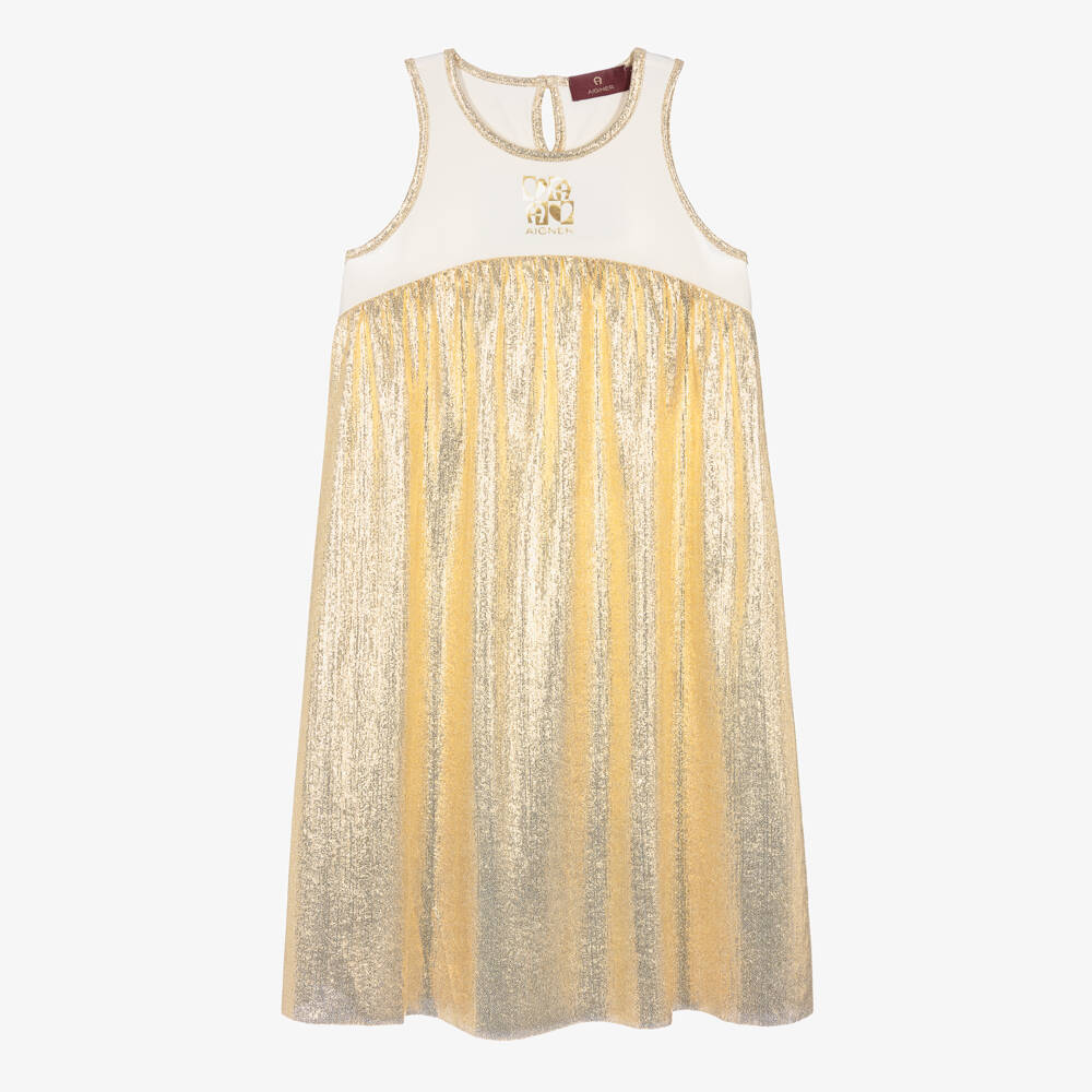 Designed by AIGNER, this metallic gold dress for teen girls adds a sparkly vibe to special occasions or parties. Printed with the brand's signature 'A' horseshoe logo on the chest in an abstract heart motif, this logo-inspired dress has a floaty gold skirt. Super metallic and sparkly, it creates a luxurious look. On the back, there is a keyhole button fastening for stylish dressing.