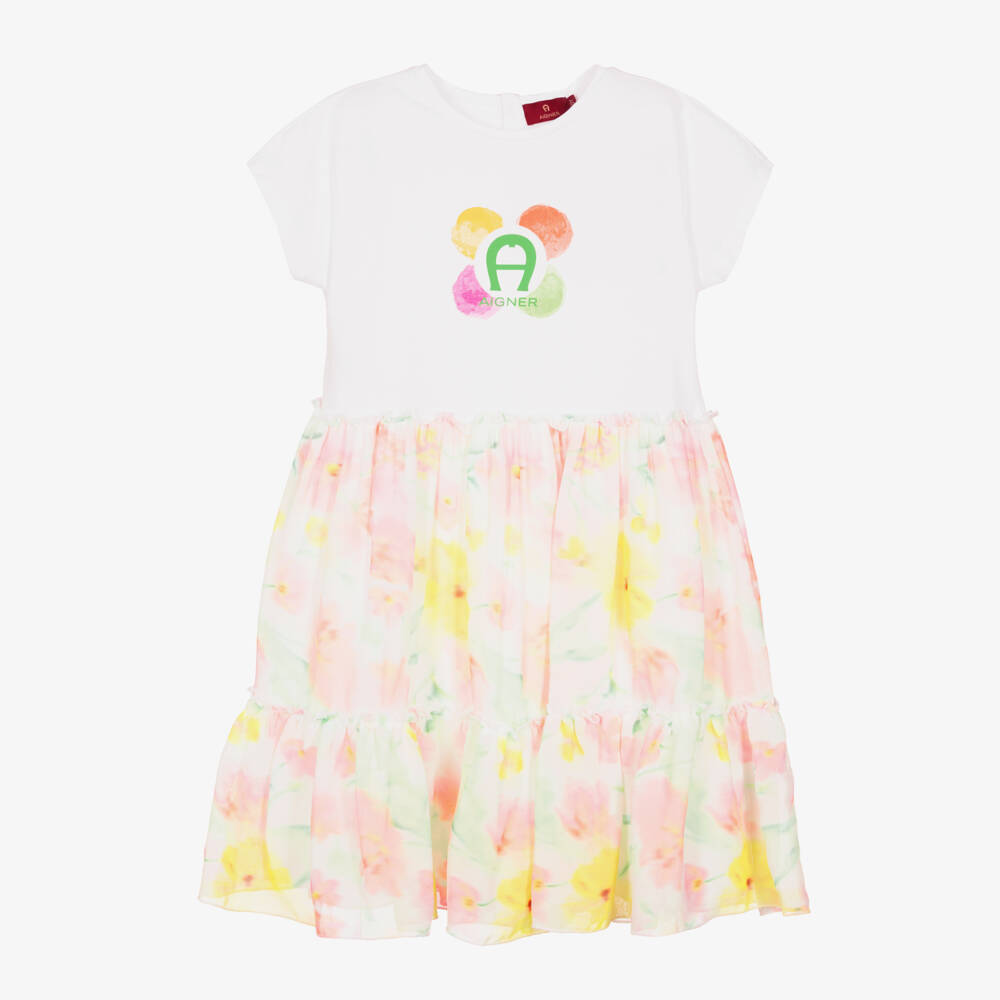 White with a colourful floral pattern, this pretty and feminine dress for teen girls is by AIGNER. Easy and comfortable to wear, the bodice is made in soft cotton jersey and the gathered skirt is in lightweight chiffon. There is a floral motif printed on the bodice, with the brand's signature 'A' horseshoe logo in the centre. The skirt is lined in lightweight cotton for comfort, and there are branded button fastenings on the back for a finishing designer touch.