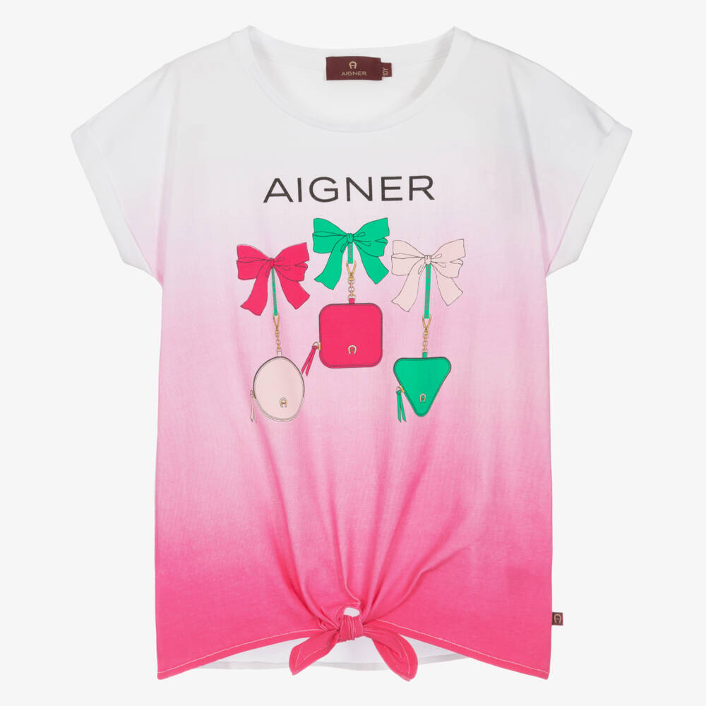 White and pink T-shirt for teen girls by AIGNER. This easy-to-wear tee has the designer's name printed on the front, along with three colourful bags incorporating the signature 'A' horseshoe. In a relaxed style with tuned-up sleeves and a tie front, it is made in soft cotton jersey with a pink ombré effect on the front.