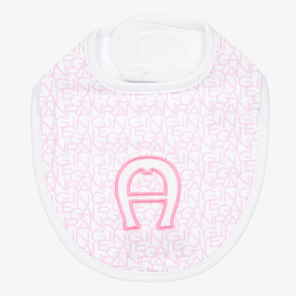 A white Pima cotton bib with a pink logo print for baby girls by AIGNER. It has a double layer of jersey, fastens with velcro and has an embroidered 'A' on the front.
