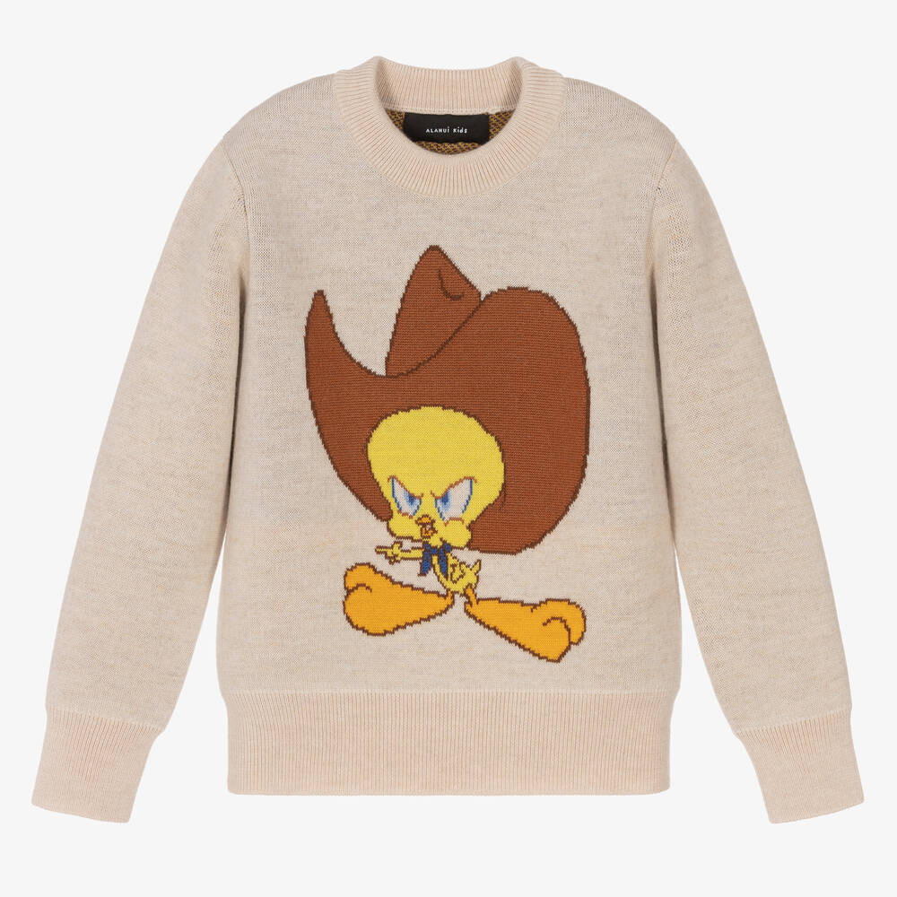 By luxury Italian knitwear brand, Alanui, this light beige sweater for boys and girls features Looney Tunes™ adored Tweety cowboy character. This beautiful piece is hand-crafted in a double jacquard knit from the finest virgin wool, taking over five hours of exquisite artisanal technique to complete. The timeless silhouette is characterised by a ribbed neckline and edges, with fun intarsia motif on the front and a Sheriff badge motif on the back to complete the look.