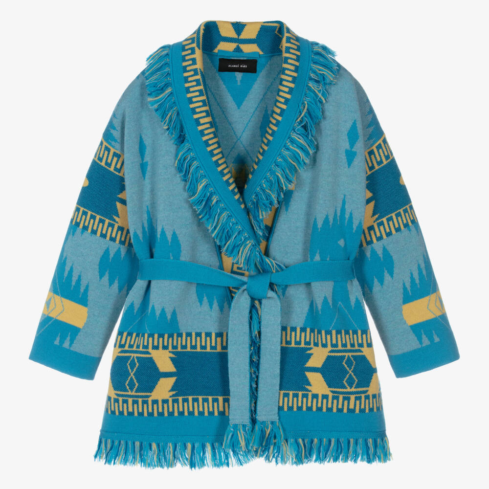 Luxury knit meets ultimate comfort, this tourmaline blue and yellow icon jacquard cardigan for boys and girls is a signature style by Alanui. It is hand-crafted in a double jacquard knit from the finest virgin wool, taking over six hours of superb Italian artisanal technique to complete. Reflecting the brand's spirit of travels and adventures, it is knitted in the iconic pattern with fringed edges. It can be worn with an open front or with the two-sided tie belt in shades of blue for optional styling.