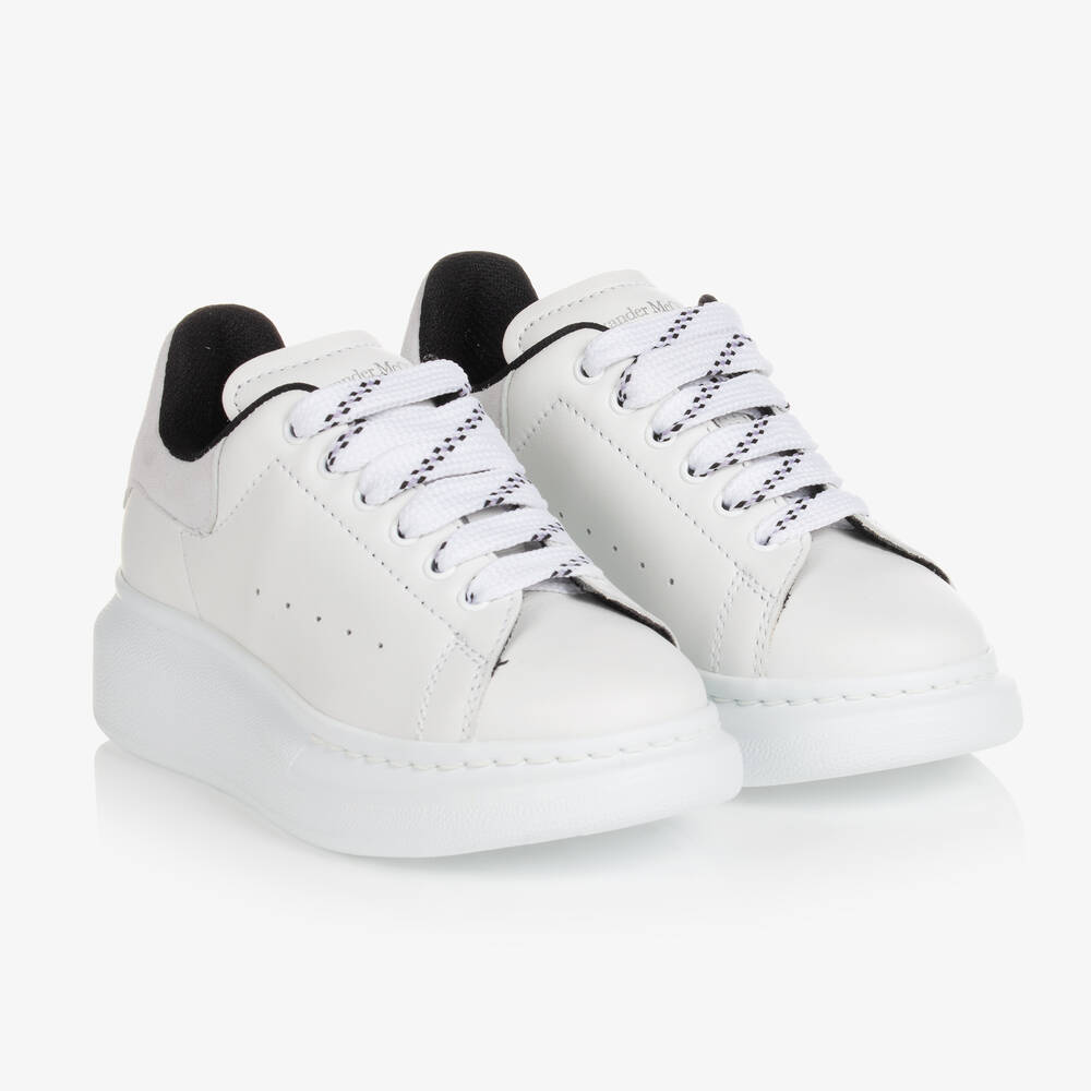White leather trainers for boys and girls by luxury British brand Alexander McQueen, with suede heel trim. For a discreet designer touch, they have silver logo prints on the tongue and heel, and a branded sole. Fastening with patterned laces, they are styled with a rounded toe and are fully lined in soft leather, with a moulded leather insole. They have a stylish oversized rubber outsole and come with an additional set of white laces.