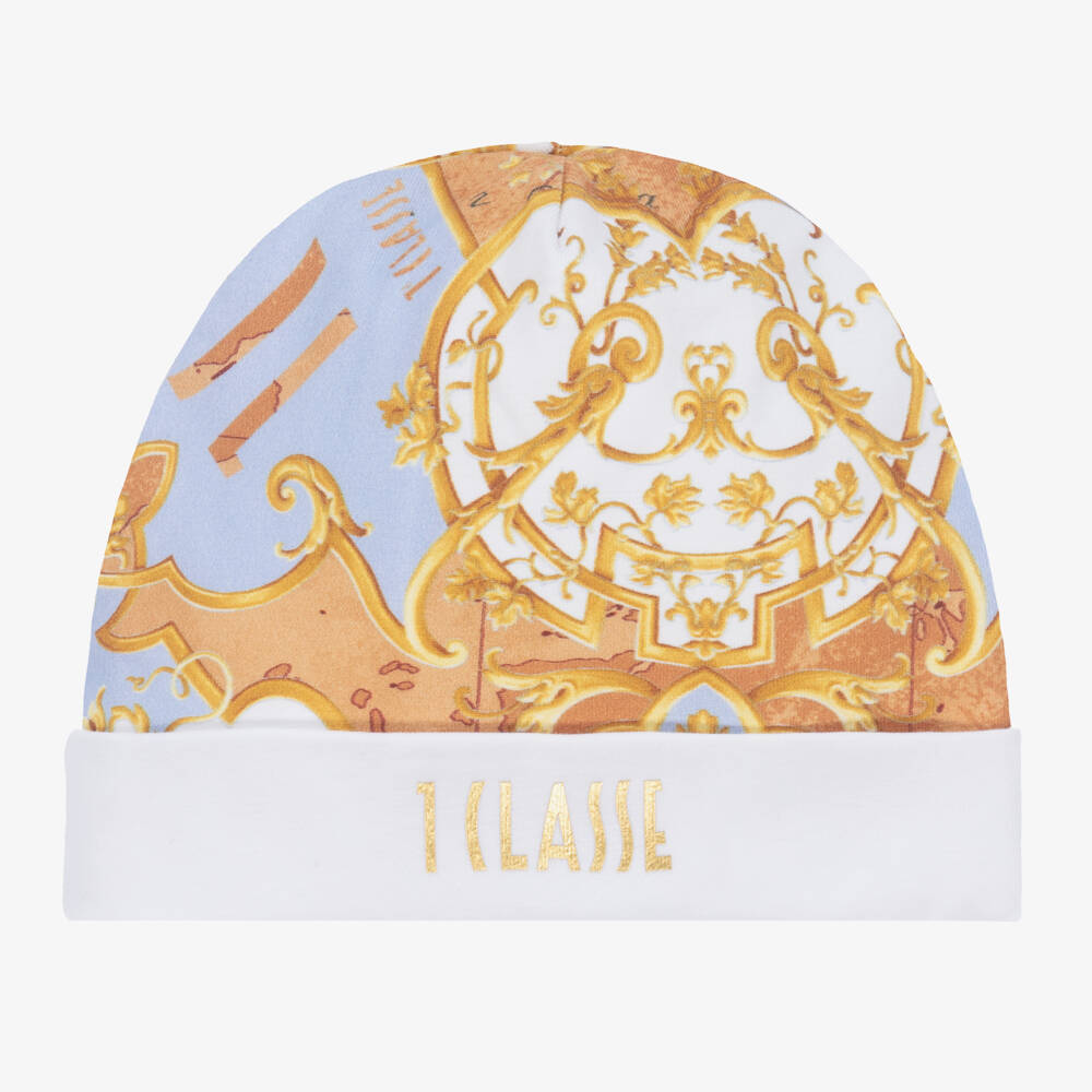 Cute blue and gold hat for baby boys by Alviero Martini, made in soft, stretchy cotton jersey. Patterned with Geo Arabic print and finished with a metallic gold 1a Classe logo on the front for instant brand recognition, this double layered hat is cool and comfortable.