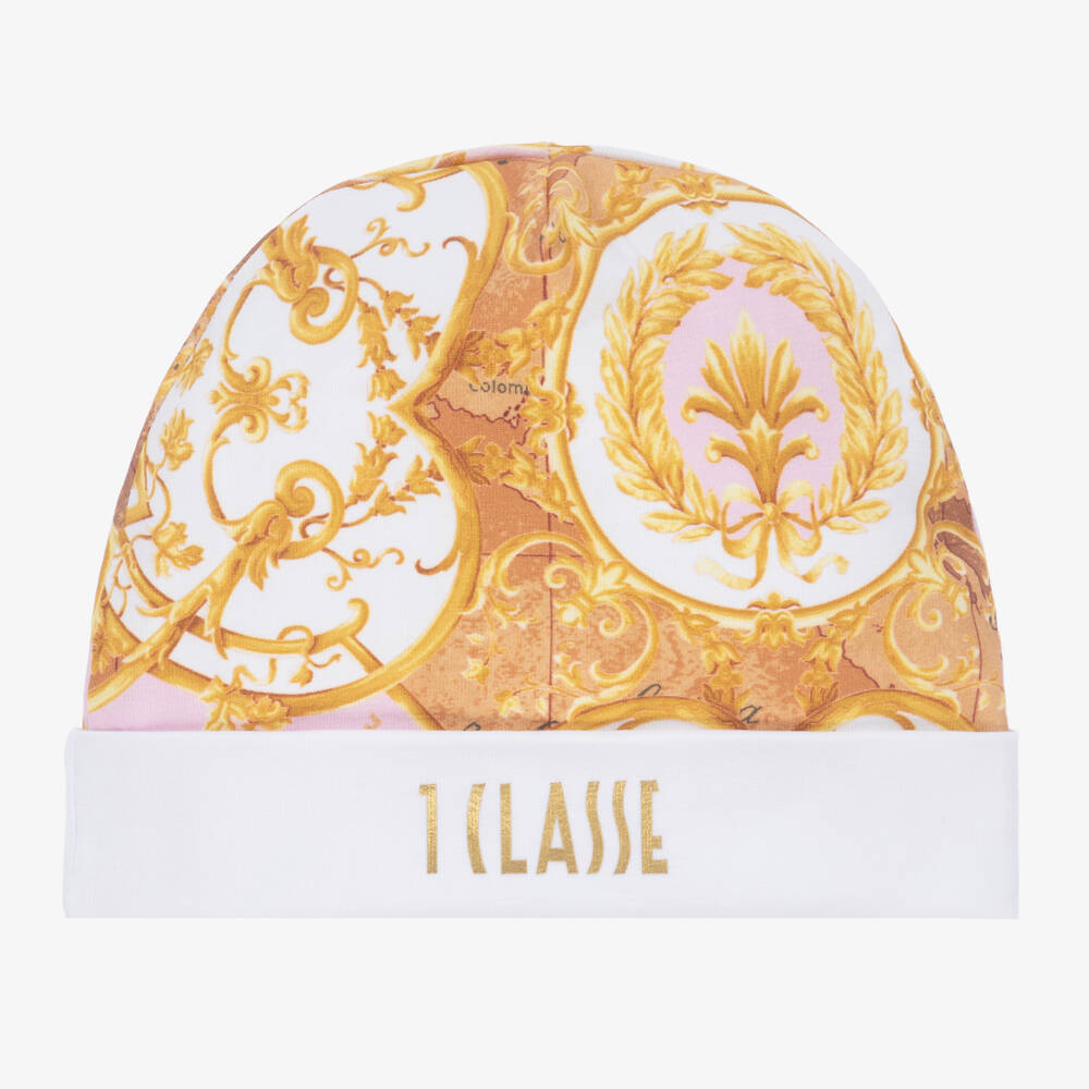 Cute pink and gold hat for baby girls by Alviero Martini, made in soft, stretchy cotton jersey. Patterned with Geo Arabic print and finished with a metallic gold 1a Classe logo on the front for instant brand recognition, this double layered hat is cool and comfortable.