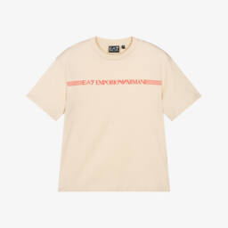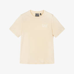 Boys colourblock T-shirt by Alviero Martini, made in comfortable cotton jersey with a contrasting Geo map panel. In beige, white and dark beige, this casual design has a crew neck and a decorative button placket on the front.