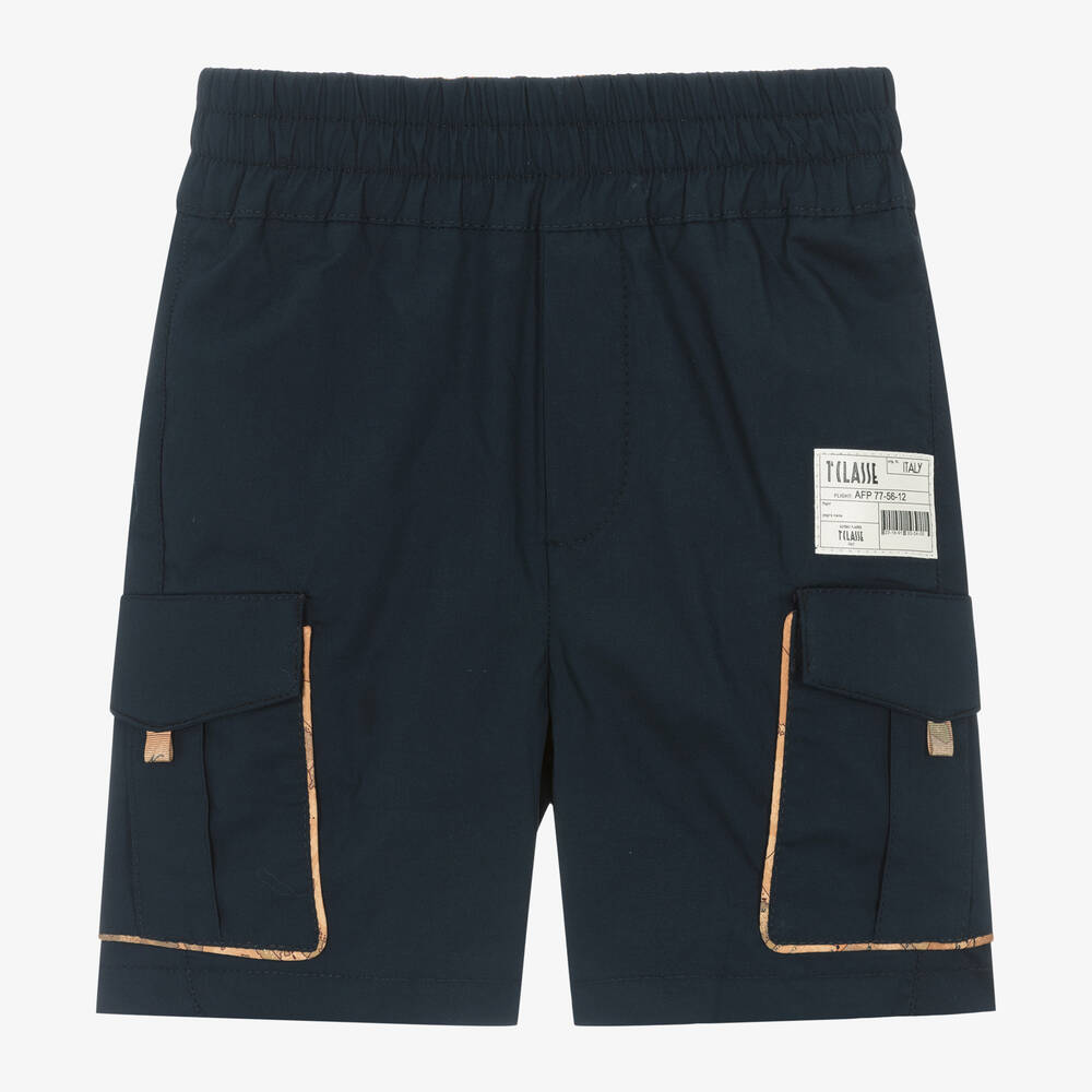 Casual navy blue cotton shorts for boys by luxury Italian brand Alviero Martini, with a hint of stretch for comfort. They are trimmed with the designer's dark beige Geo map print on the cargo pockets and on the inside of the elasticated waist. Inspired by airport luggage tags, they have a white logo label sewn on the front.