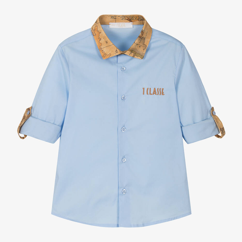Smart pale blue cotton shirt for boys by luxury Italian brand Alviero Martini, with a hint of stretch for comfort. It is trimmed with the designer's dark beige Geo map print on the collar and cuffs, with their signature '1a Classe' logo embroidered on the chest. The long sleeves have a fixed button tab to allow for a more casual look, and the button fastenings are embossed for a subtle designer finish.