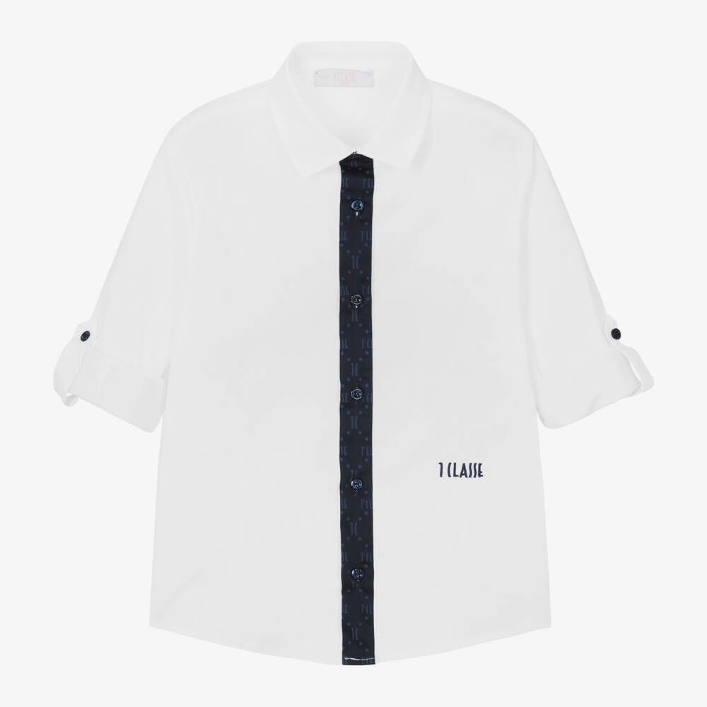 A white cotton shirt for boys by Italian brand Alviero Martini, styled with a pointed collar and buttoned cuffs. Lightly woven, this timeless style has dark navy blue trims with a tone-on-tone monogram print. A 1a Classe logo is embroidered on the front for further designer identity. The long sleeves can be rolled up and secured with buttons for a more casual look.