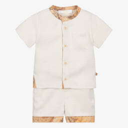 White polo shirt and pale beige cotton shorts set for boys by luxury brand Alviero Martini. Both pieces are trimmed with the designer's dark beige Geo map print for a distinctive look. The jersey polo shirt has a ribbed collar, a short button placket, and vented sides for ease of movement. Styled with three pockets, the poplin shorts have an adjustable waist for an ideal fit.