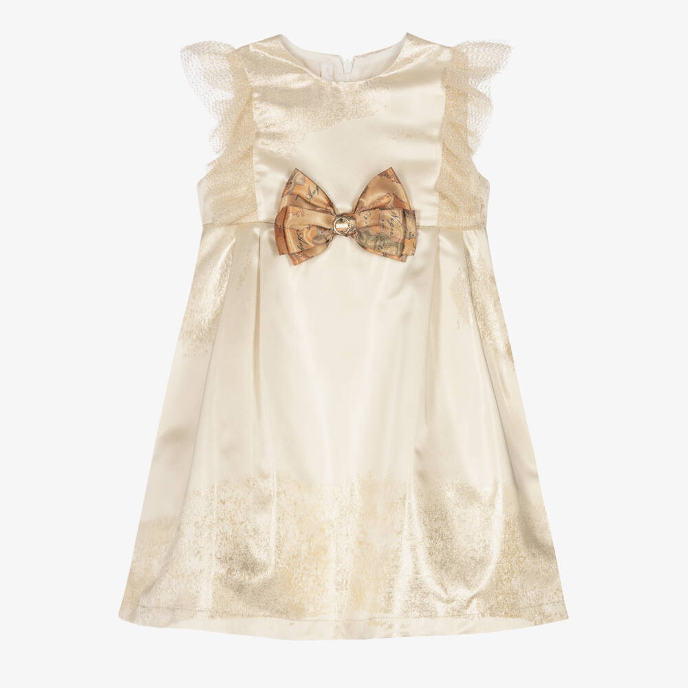 Girls gold Geo map print dress by Alviero Martini. The jacquard fabric has a lovely gold woven pattern of the designer's signature map print, with gold mesh frill details on the sleeves. The waist is highlighted with a dark beige Geo map print bow with a 1st Classe logo badge. There is a concealed back zip to fasten and tulle underskirts to create volume.