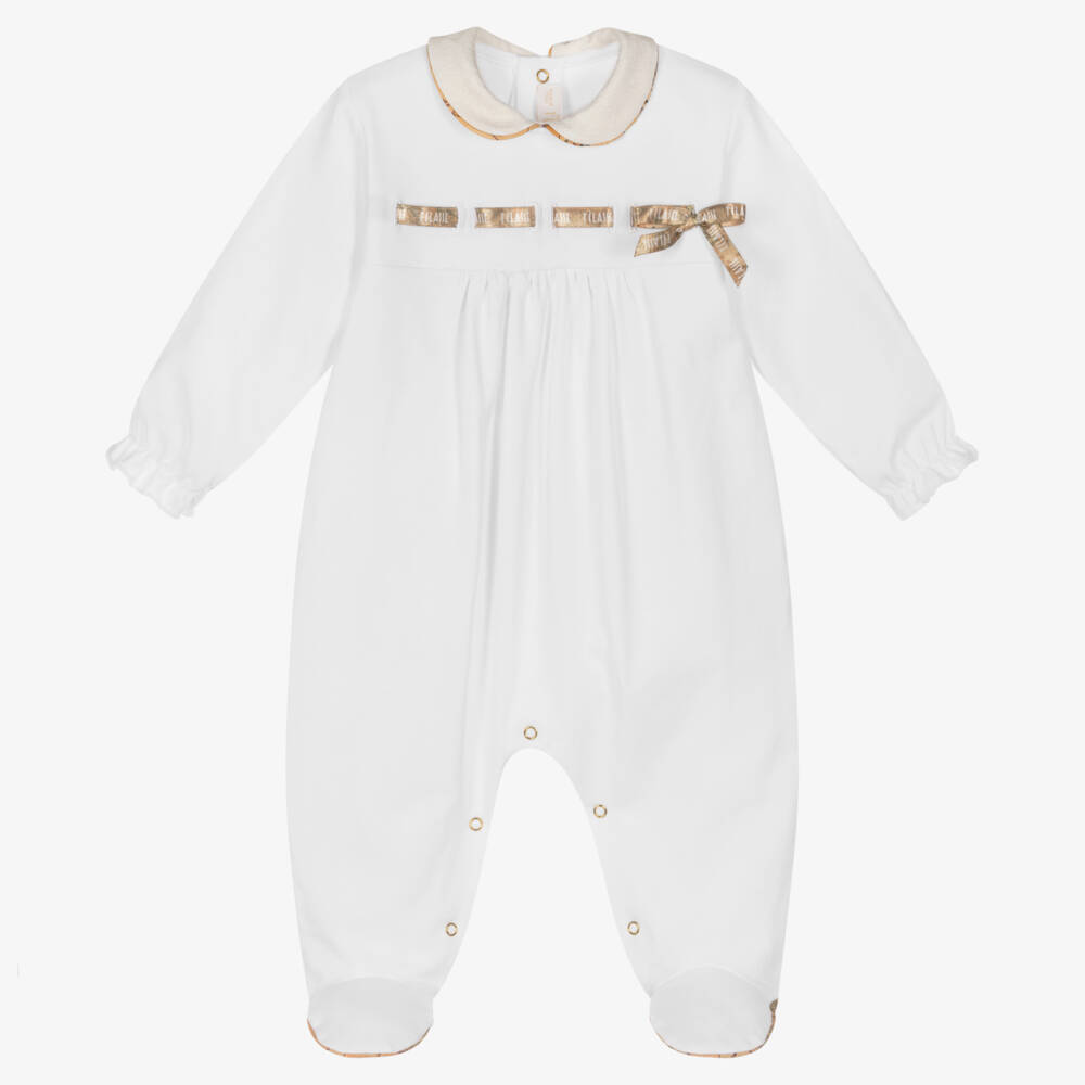 White babygrow for girls by luxury Italian brand Alviero Martini. Trimmed with designer's distinctive dark beige Geo map print on the feet and on the shimmery gold collar, it has a Geo map satin ribbon detail across the chest. Kind and gentle on delicate skin, the babysuit is made in soft cotton jersey, with easy fastening poppers on the back and between the legs.