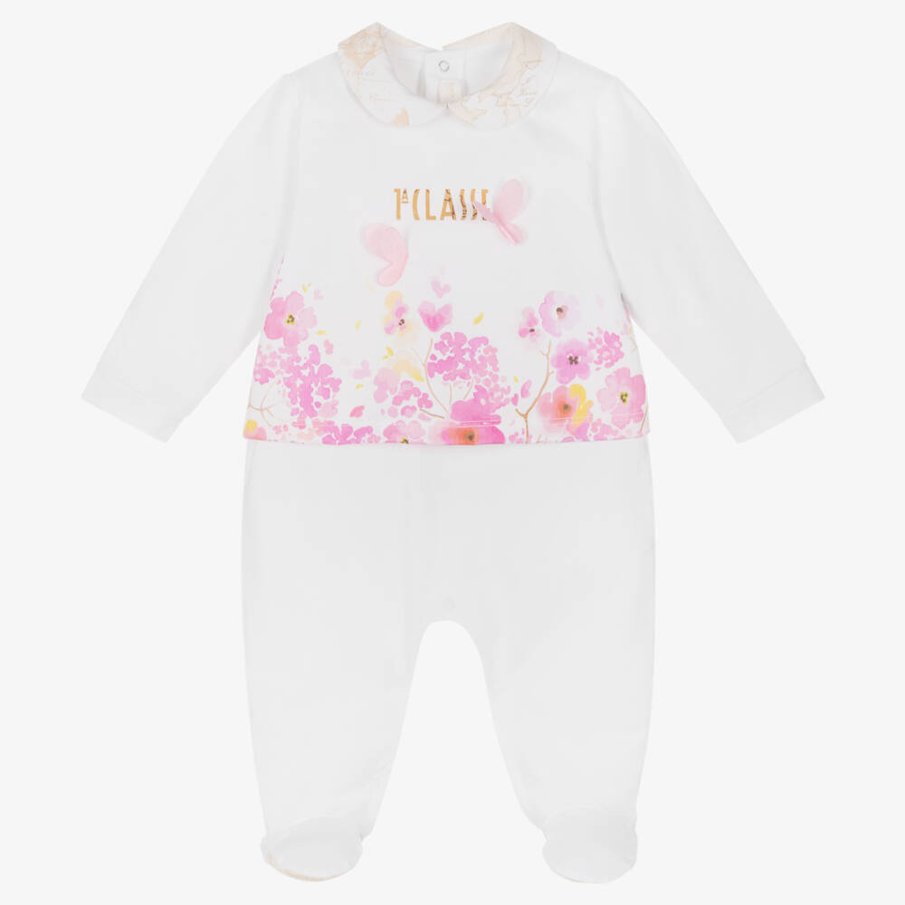 White babygrow for girls by luxury Italian brand Alviero Martini. The front overlay has a pretty pink floral print, with 3D butterfly appliqués and a signature 1a Classe logo in dark beige. The brand's distinctive light beige Geo map print is on the Peter Pan collar and on the enclosed feet. Kind and gentle on delicate skin, the babysuit is made in soft cotton jersey, with easy fastening poppers on the back and between the legs.