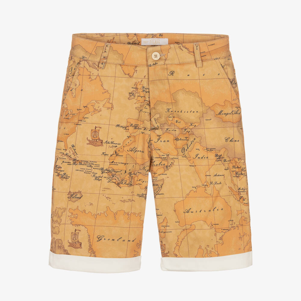 Smart-casual dark beige shorts for teen boys by Alviero Martini, patterned in the brand's signature Geo map print. Instantly recognisable by the Italian brand, they have stylish turned-up cuffs and slanted pockets. Crafted in soft cotton, they have a luxe feel and fasten with a branded button and zip to sign off the look with a logo-inspired twist.