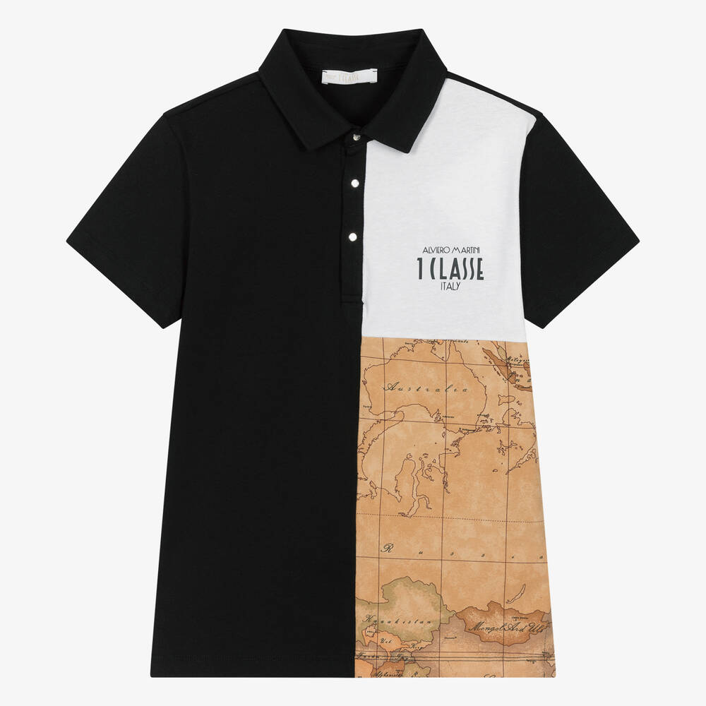 Black polo shirt for teen boys by Alviero Martini, in a cool colourblock style. It has a dark beige panel featuring the Italian brand's distinctive Geo Map print and a white chest panel with a black 1a Classe logo motif. Made in soft and comfortable cotton jersey, it is finished with a pointed collar and branded silver popper fastenings for a contemporary upgrade to this classic look.