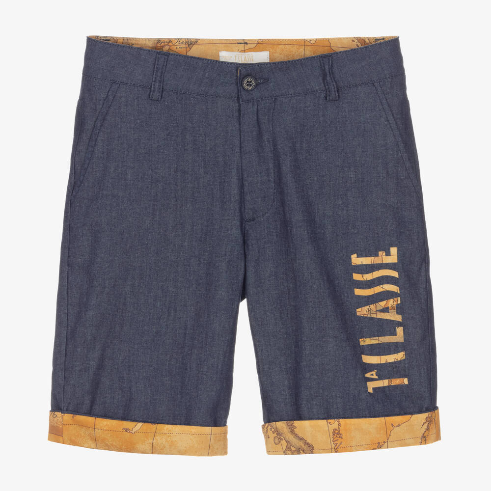 Distinctive blue chambray shorts for teen boys by Alviero Martini, characterised with the 1a Classe logo on the leg in a dark beige Geo map print. With pockets on the front and back, these casual shorts have turn-up cuffs in a coordinating print for a signature look. They fasten with a button and zip on the front for a comfortable fit.