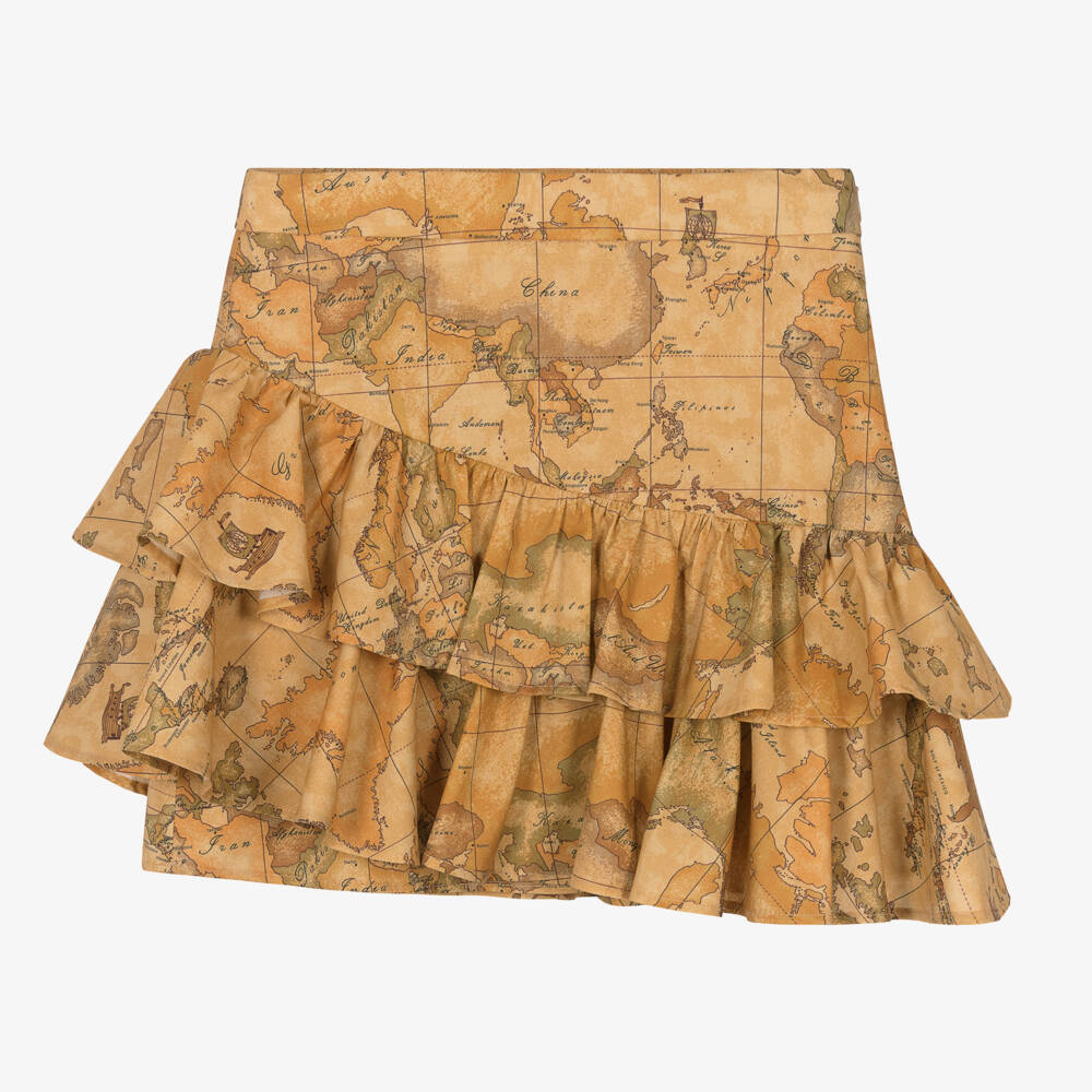 Teen girls stylish beige mini skirt from Alviero Martini, patterned in the signature Geo map print. It has a ruffle decorated in an asymmetric shape for a contemporary feminine look, fastening effortlessly using a concealed zip. Made from soft cotton poplin, it is finished with a soft lining.