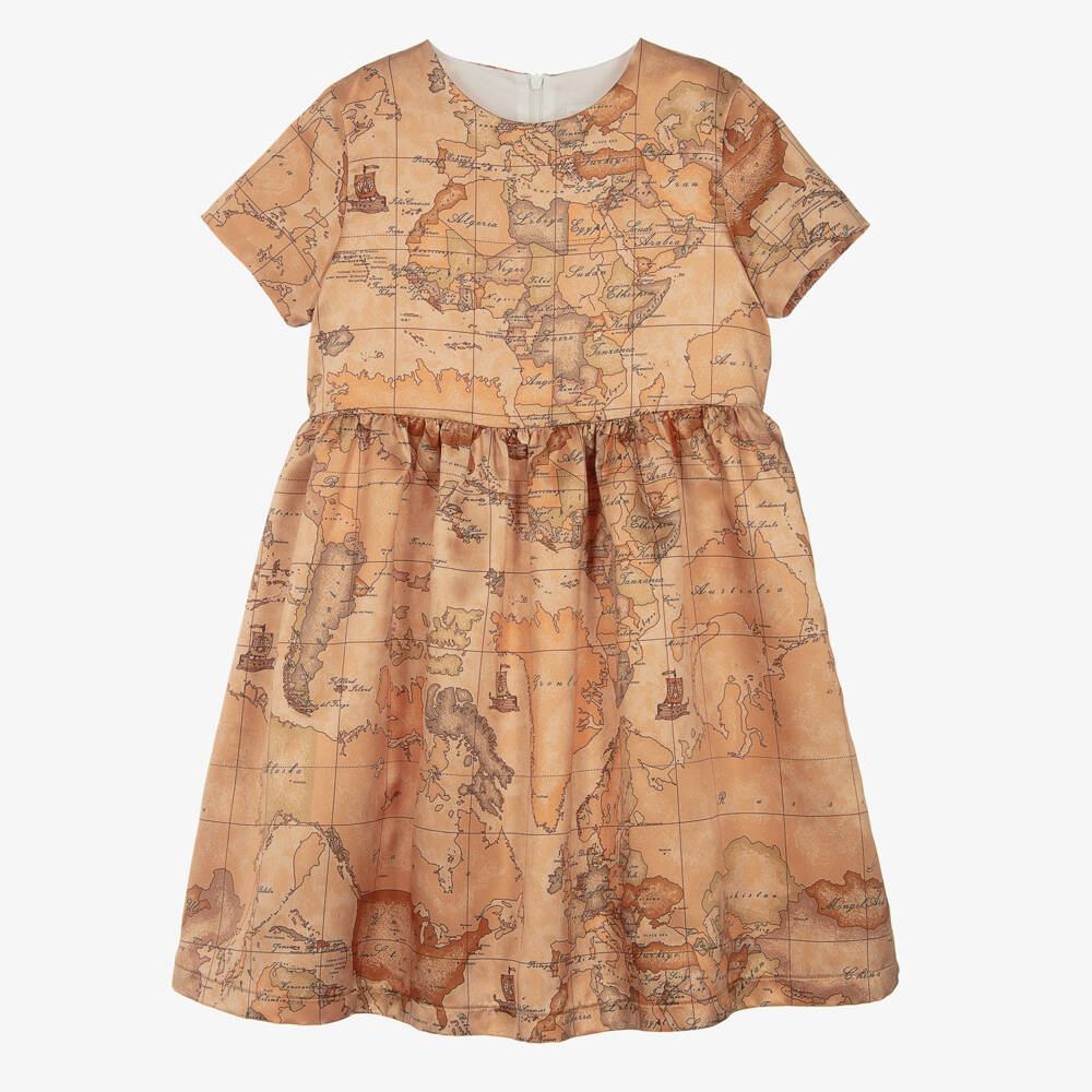Unmistakably by Italian fashion house Alviero Martini, this gorgeous satin dress for teen girls is patterned in the designer's dark beige Geo map print. It is made in silky smooth satin for luxurious feel, with a lightweight cotton lining for added comfort. The lining is trimmed with tulle around the hem, adding volume to the full gathered skirt. There is a concealed zip fastening on the back for a discreet finish.