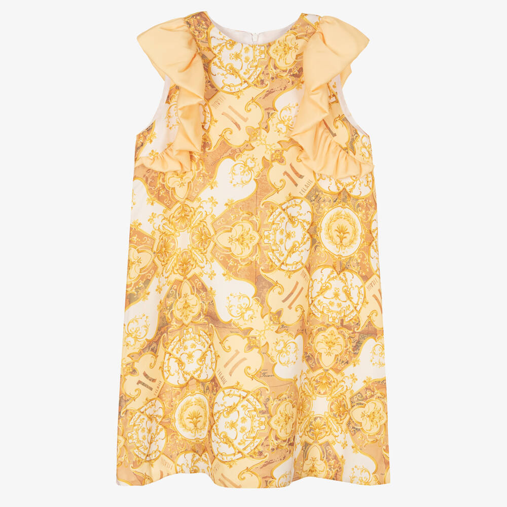 Teen girls gold A-line dress by Alviero Martini, lovely for special occasions. This silky style has a stunning 1a Classe logo print all-over, intertwined with a gold Arabic print for a luxe effect. Effortlessly chic and feminine, it has yellow ruffle sleeves with a matching V-shaped ruffle on the back for a stand-out look. A pretty bow decorates the bow with shiny gold logo detailing, to add a touch of glamour. It fastens with a concealed zip on the back for a seamless illusion.