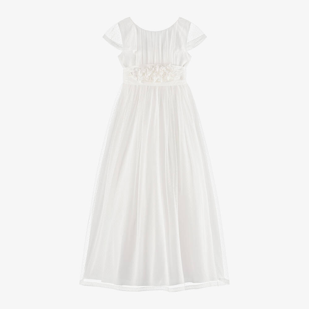Beautiful ivory special occasion dress for older girls by luxury designer, Amaya. Exquisitely made in embroidered tulle, this stunning dress has a fitted bodice with capped sleeves. Sheer tulle covers the shoulders, with delicate Chantilly lace complementing the look with a traditional feel. There is a gathered sash belt around the waist, which ties into a gorgeous bow on the back and is adorned with a pretty petal flower, pin-fastening brooch. The voluminous skirt elegantly drapes down to the floor, and is lined in soft layers of structured tulle for shape and lightweight cotton-blend fabric for comfort. It fastens with buttons on the back for a discreet, seamless finish.
