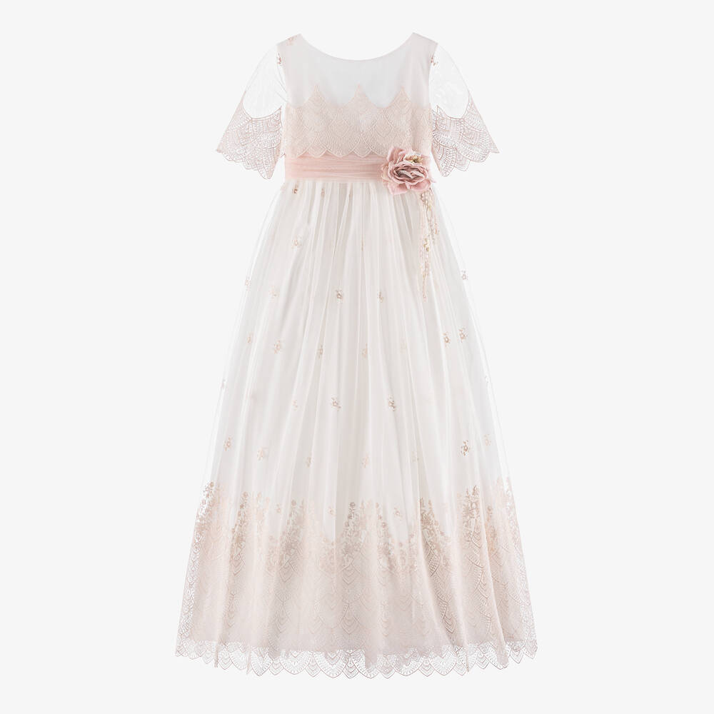 Wonderfully enchanting, this ivory and pink floor length dress for girls by Amaya is ideal for special occasions. Made from lightweight tulle, the layered bodice, sheer short sleeves, and hemline have a charming pale pink scallop-edged embroidered design. Delicately stitched with dainty floral motifs, the skirt has a soft woven lining and underlayers of mid-weight tulle for additional volume and impact. Fastening with covered buttons on the elegant V-back, it has a fixed pale pink sash that ties into a pretty bow and a beautiful faux rose clip-on brooch for a feminine finish.