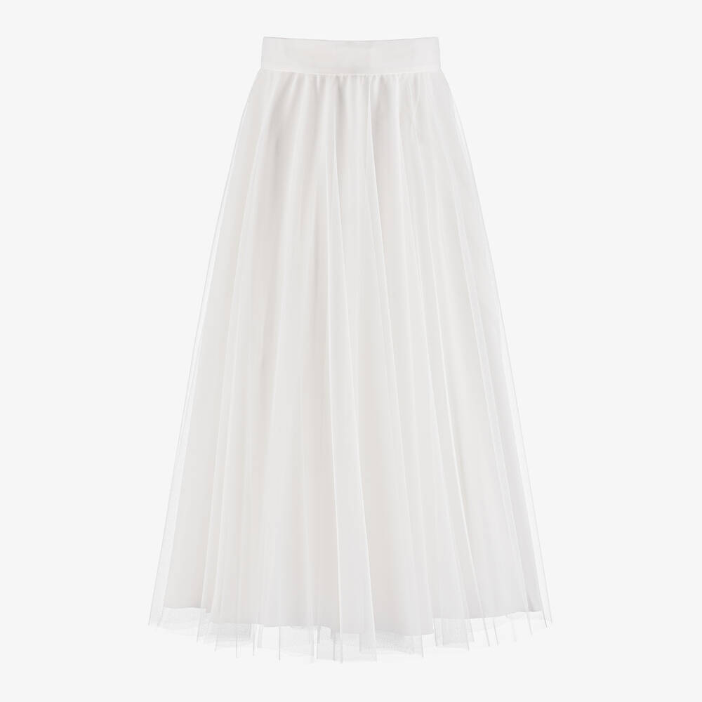 A beautiful ivory tulle skirt for older girls by luxury brand Amaya, ideal for a special occasion. This stunning floor-length skirt is fully lined for added comfort and a fuller look with a useful adjustable waist. It has a simple A-line shape and fastens neatly on the back of the waistband with fabric-covered buttons.