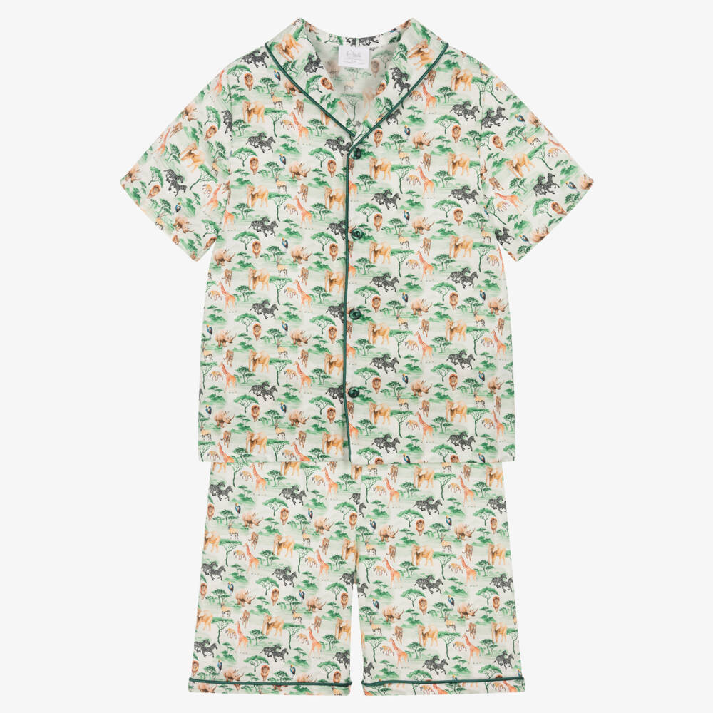 Fun green short pyjamas for boys by AMIKI Children, made in lightweight cotton. They have a jungle animal print, including elephants, lions, zebra and giraffe, with green satin piping. The top has a revere collar and front button fastenings, whilst the shorts have a comfortable, elasticated waistband.