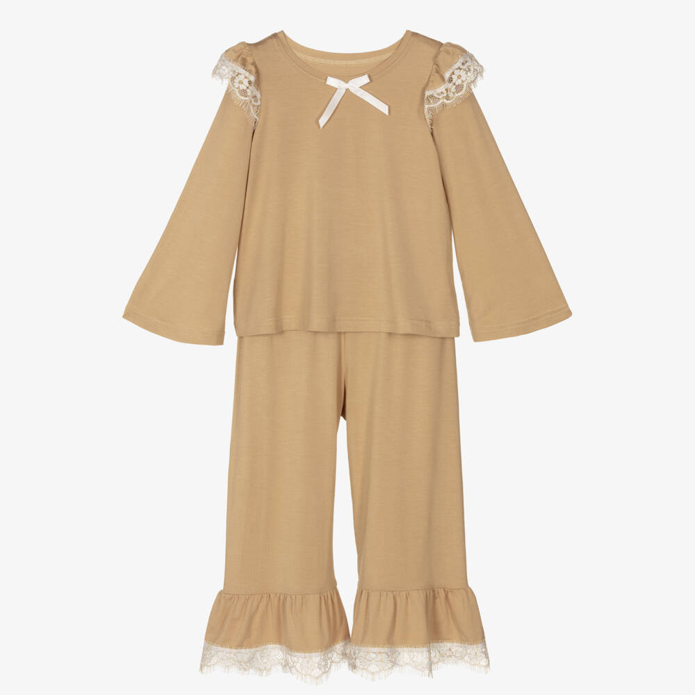 Girls beige pyjamas by AMIKI Children, made from micromodal rayon. Luxuriously soft and lightweight, the top has pretty, frill shoulders with delicate ivory and gold lace trims, and a white ribbon bow on the chest. The matching, loose-fitting trousers have a stylish flared cuff and are gently elasticated for a comfortable night's sleep.