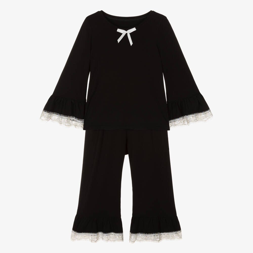 Black pyjamas for girls by AMIKI Children, made from luxuriously soft micromodal jersey. The long-sleeved top has fluted cuffs, white lace trims, and a sweet ivory bow at the neckline. To complement the top, the loose-fitting trousers have matching trims and are gently elasticated at the waistband for a comfortable fit.