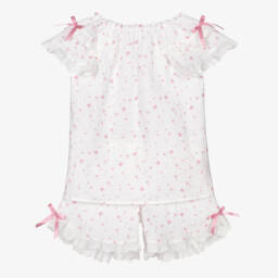 Girls ivory and blue pyjamas by AMIKI Children, made from soft cotton sateen, ensuring a gentle touch against the skin. The classic set features a charming floral pattern with delicate lace trims and satin bows, adding a touch of elegance. The short-sleeved top and matching shorts have elasticated trims, ideal for a comfortable night's sleep.