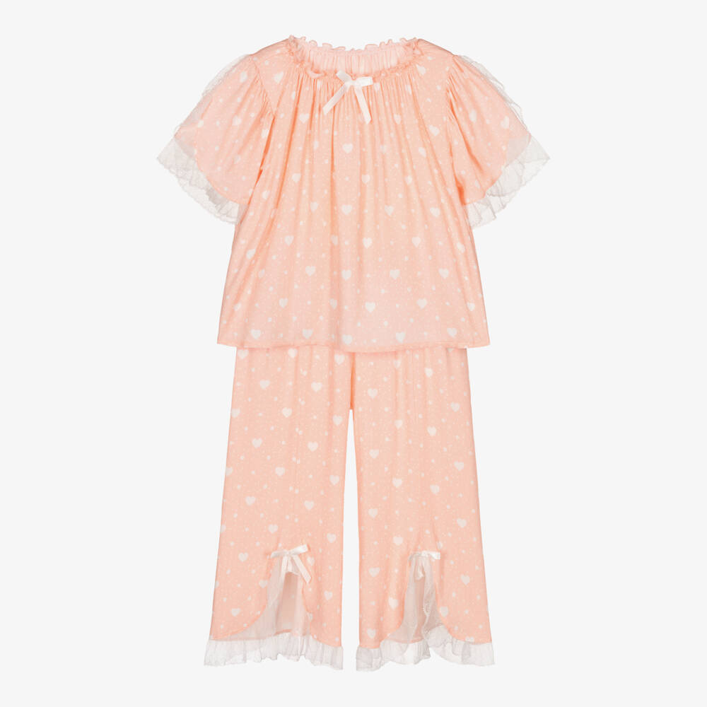 Lovely pink pyjamas for girls by AMIKI Children, with a white heart pattern. Made in beautifully soft and lightweight viscose, they are designed for a comfortable, loose fit, with an elasticated neckline and waist. They are beautifully finished with delicate white lace, satin bows and shaped cuffs.