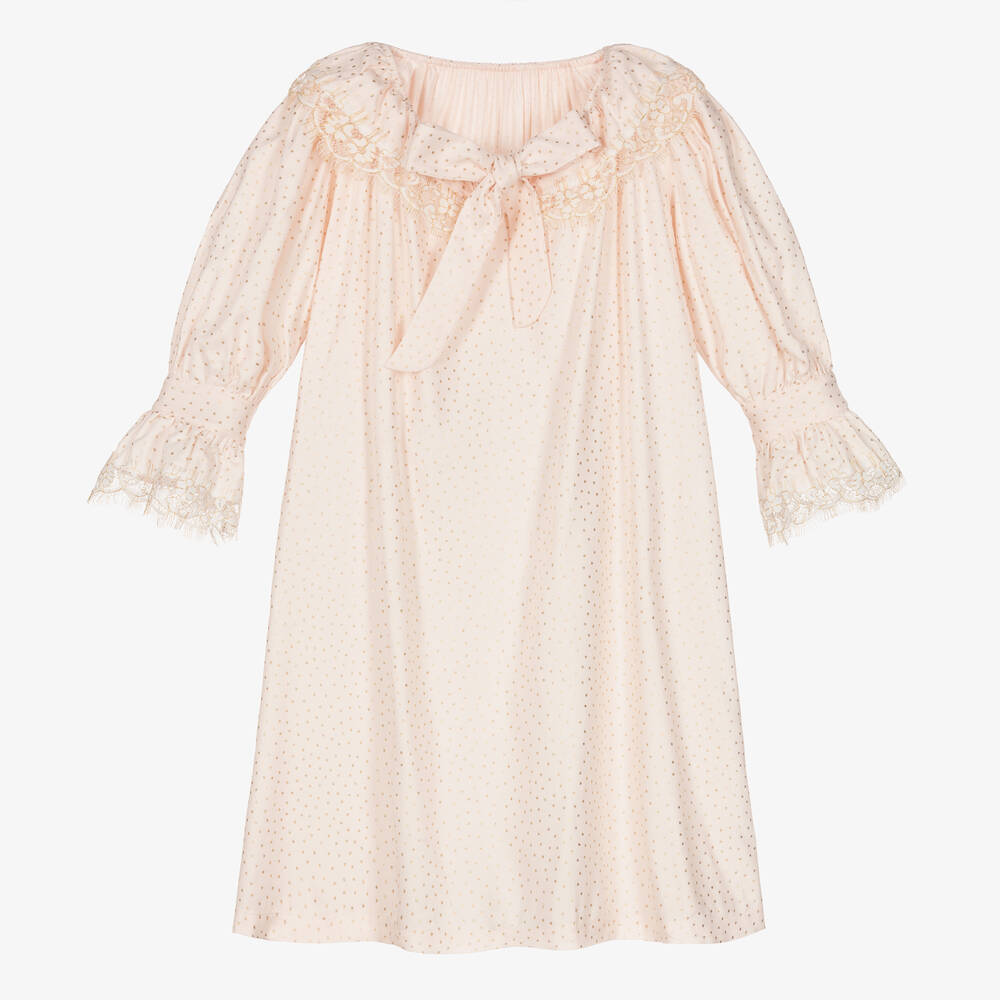 A beautiful pale pink nightdress for girls by AMIKI Children, made in luxuriously soft and lightweight viscose. Patterned in metallic gold polka dots, it has a gently elasticated neckline with a traditional collar edged with delicate ivory and gold lace. The full sleeves are gathered at the wrist and trimmed beautifully to match the collar. It has pretty ties on the back that can be fastened into a bow.