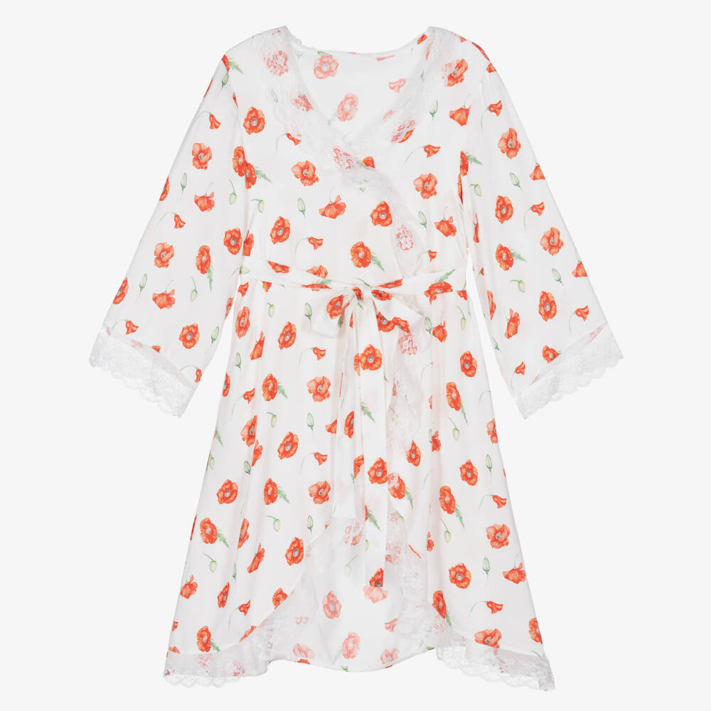 White dressing gown for girls by AMIKI Children. Super soft and lightweight, it has a pretty red poppy pattern, white lace trims and a removable tie belt.