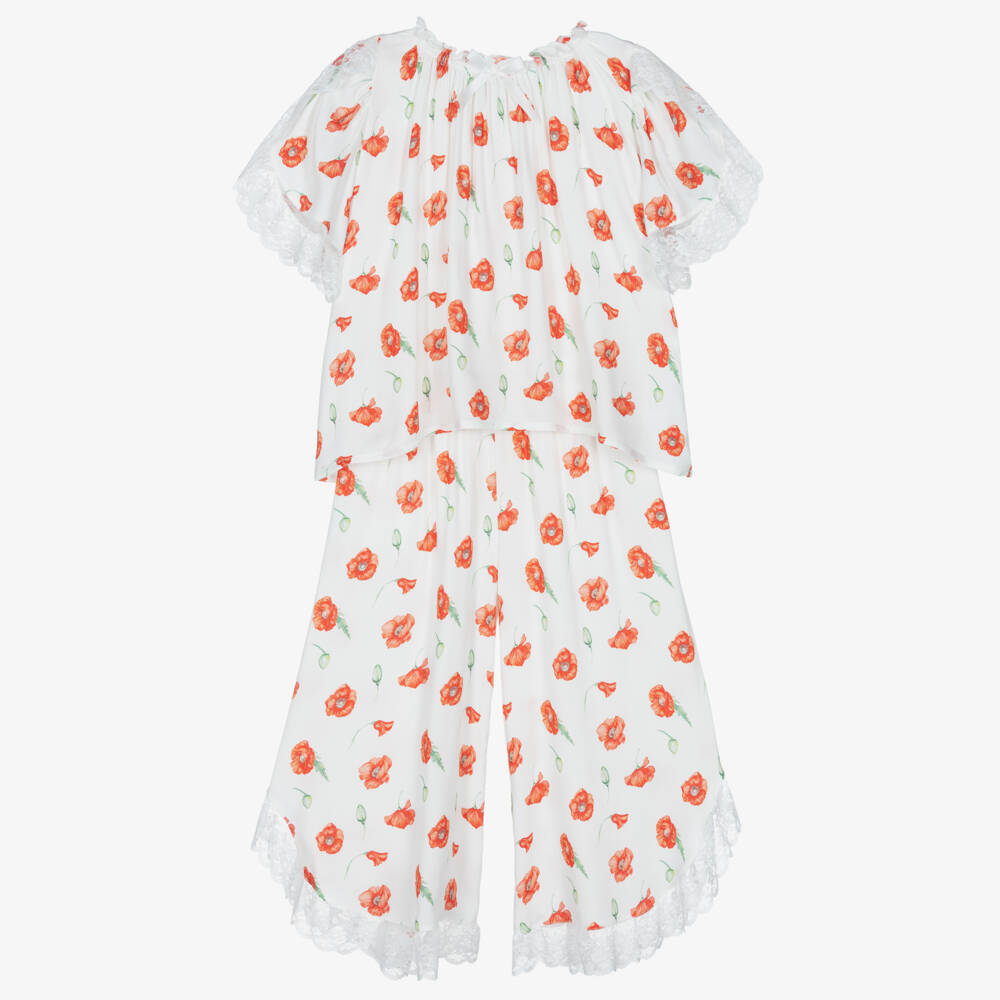 Lovely white long pyjamas for girls by AMIKI Children. Super soft and lightweight they have a pretty red poppy pattern and white lace trims. The top has a gently elasticated neckline with a white satin bow and the wide-leg trousers have a comfortable elasticated waistband.