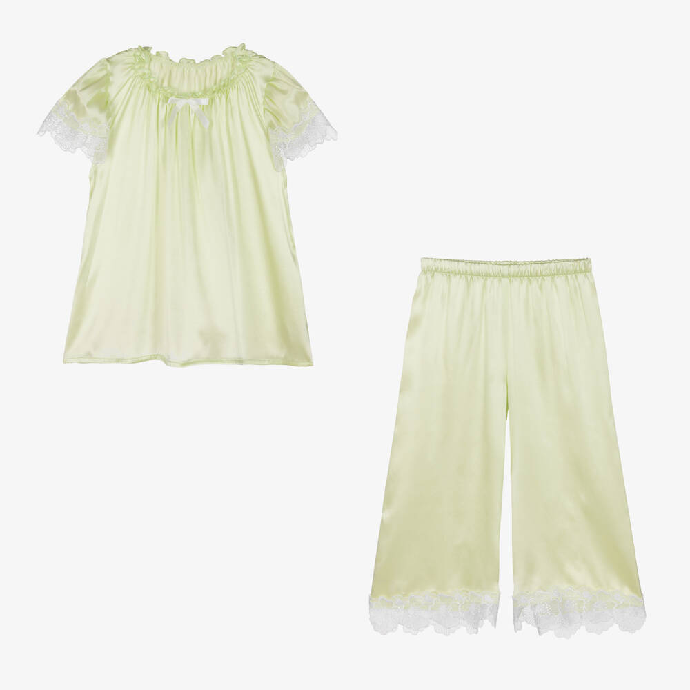 Lovely pale green loose-fitting pyjamas for teen girls by AMIKI Children, made in luxuriously soft silk. Great for adding a touch of luxury and elegance to bedtime, both items have gold lace flower trims. The top has a gently elasticated neckline with an ivory satin bow.